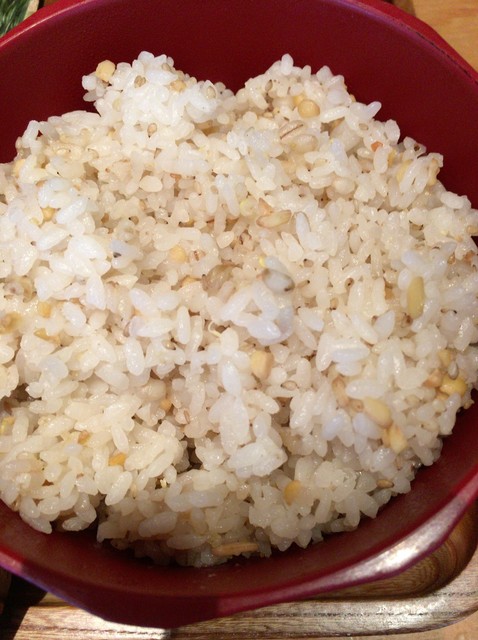 ご飯は雑穀米のようです。二人分が1つのおひつに入っていて、自分たちで分けるようです。