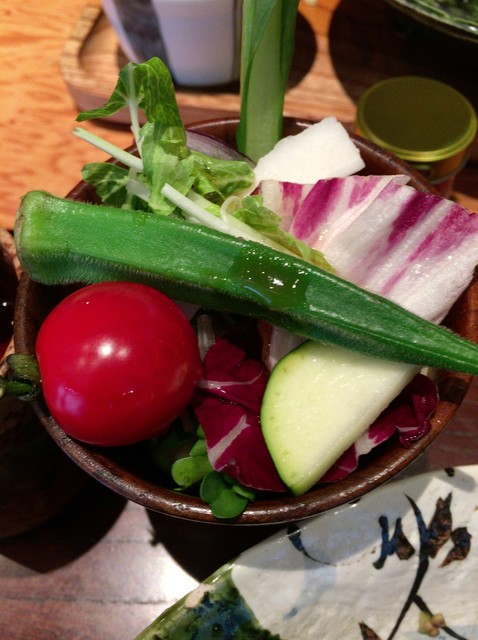 温野菜には、エリンギ、シメジなどキノコ3種など。オクラはカット無しで丸ごとありました。