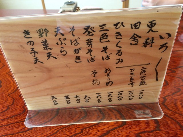 さらに、この3種とも同じ1080円とのこと。貴重な「更科」も同じ値段にしているというので、ならば、「更科」を頼まないわけにはいきません。それに、私の好みは過去の経験から殻が混じっている「田舎」ではなく、実だけの方なのですから。