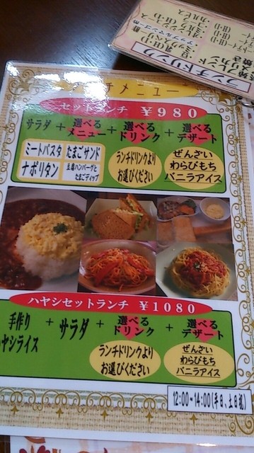 「セットランチ」は、980円で、ハヤシライスではなく、ミートパスタ、たまごサンド、ナポリタン他から1つを選び、他に、ドリンクとデザートがつきます。