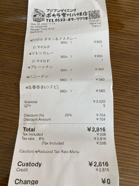 合計、3,520円→2,816円。クレジットカードで支払いました。