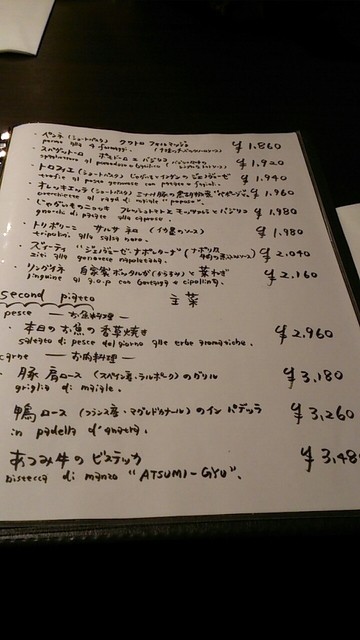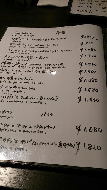 注文したのは、前菜として、リボッリータ(お野菜と豆の具だくさんスープ)(\380)をそれぞれ一つずつと、おこぜのフリット(\1,420)。