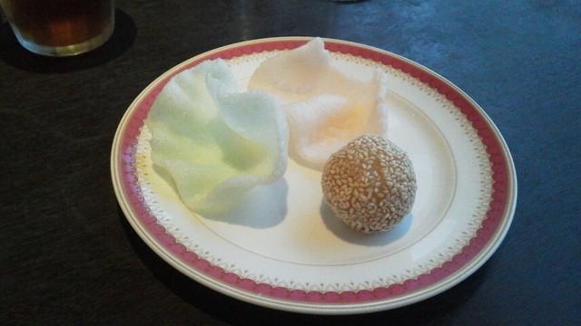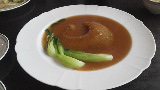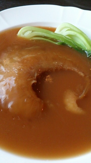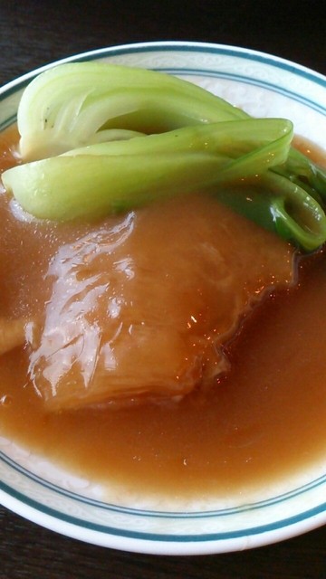 ソースも分けて小皿で食べます。比較するものがないのでこれがおいしいフカヒレかそうでないかわかりませんが、値段ほどのおいしさはありません。もっとも、フカヒレの貴重さがあるのは間違いないでしょうが。ただ、厚みは結構あるし、大きさも手のひら大で、まずまずだろうと思います。店の人も大きさと価格はおすすめだと実感をこめて言っていました。