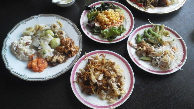 大きな皿に並べてある料理を片っ端から基本的に2個ずつ取っていきます。連れは、サラダ方面です。それだけで大きな皿2つと小さな皿3つとスープ1つとドリンク2つがテーブルに並びました。ドリンクは私がアップルジュース、連れがオレンジジュースです。