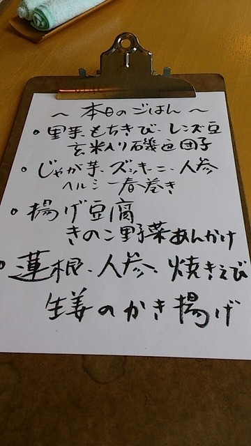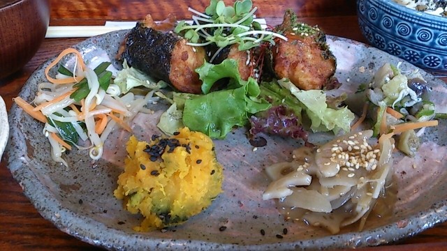 本日の日替りランチか玄米チャーハンランチかが選べ、4種ある本日の日替りランチのうち、「じゃが芋、ズッキーニ、人参 ヘルシー春巻き」と、連れが、「里芋、もちきび、レンズ豆 玄米入り磯辺団子」を選びました。