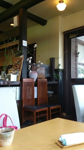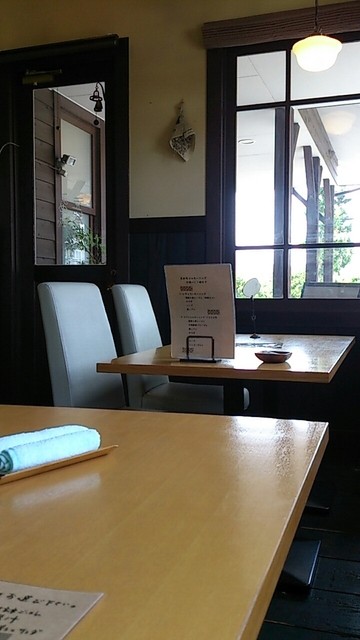 中に入ると、奥の川に面した窓側のスペースは満席のようで、手前のスペースで好きな席へどうぞという感じで案内され、2人テーブルもありましたが、4人テーブルに2人で座りました。