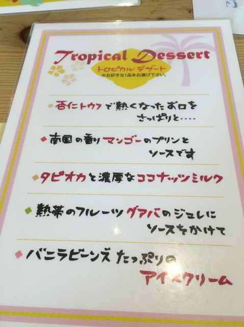 メニューの説明を聞きます。ドリンクバー、サラダバー、トロピカルデザートがついていて、ナンも食べ放題のようです。