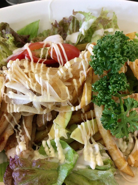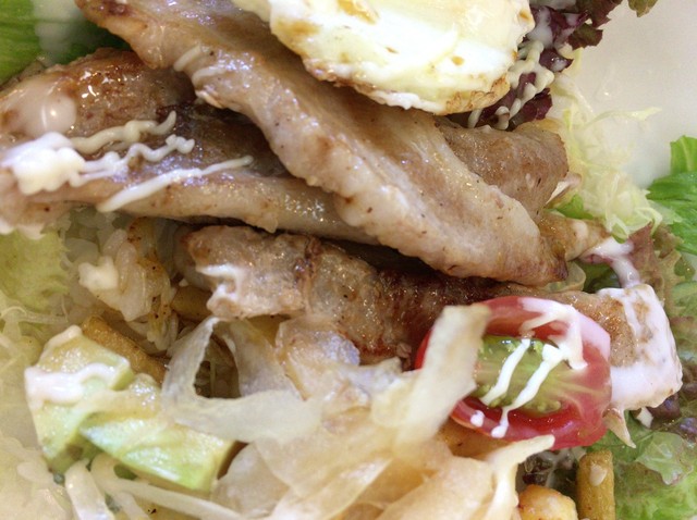 内容は、フライドポテト、目玉焼き、レタス、ミニトマト、パセリ、キャベツ、豚バラ、玉ねぎ、アボカド、ご飯です。