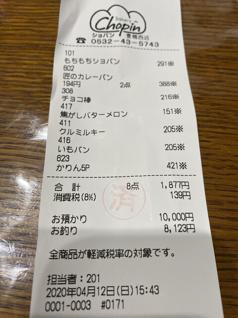 購入したのは、もちもちショパン(291円)、匠のカレーパン(194円×2個)、チョコ棒(216円)、焦がしバターメロン(151円)、クルミルキー(205円)、いもパン(205円)、かりんとうまんじゅう(黒糖風味 こしあん入り)5P(421円)。