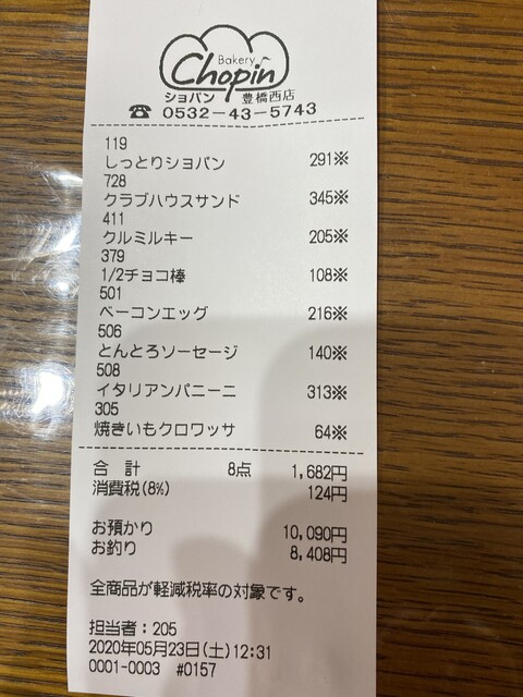 購入したのは、しっとりショパン(291円)、クラブハウスサンド(345円)、クルミルキー(205円)、1/2チョコ棒(108円)、ベーコンエッグ(216円)、とんとろソーセージ(140円)、イタリアンパニーニ(313円)、焼きいもクロワッサン(64円)。合計、1,682円。