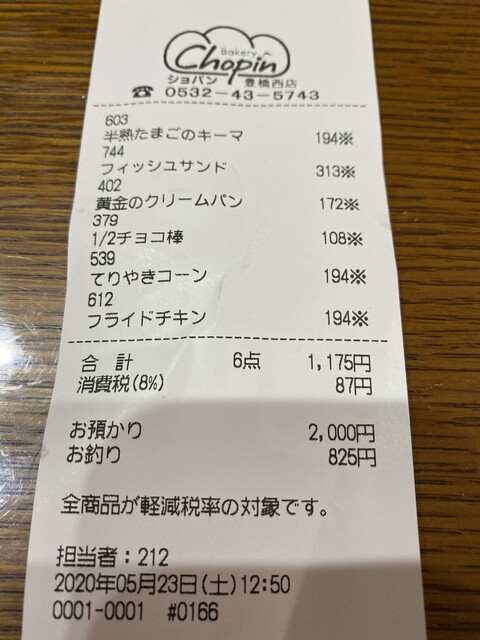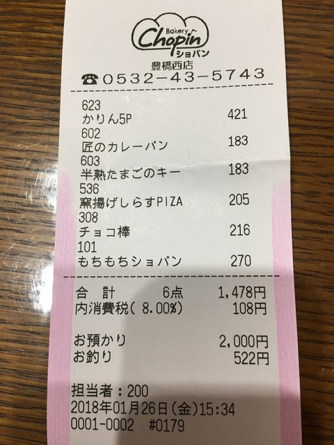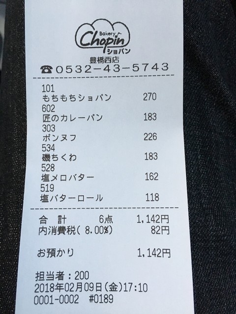 購入したのは、匠のカレーパン(183円)、ヤマサ磯ちくわ(183円)、ポンヌフ(226円)、もちもちショパン(270円)、塩メロバター(162円)、塩バターロール(118円)。合計、1,142円です。
