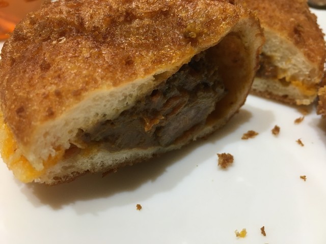 半熟卵のキーマカレーパン(183円)より、「牛肉ゴロゴロ匠のカレーパン」(183円)の方がスパイシーで美味しいです。