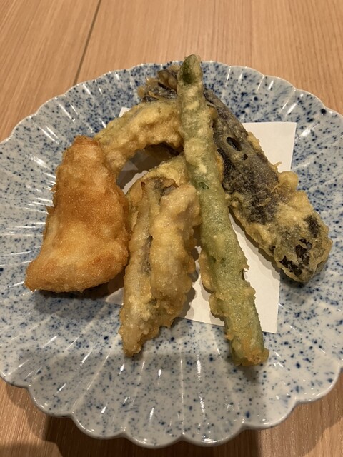 天ぷら:素材が野菜、お肉、練り物、チーズと豊富です。塩で食べるのであっさりいただけます。