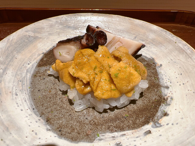 ⇒赤雲丹:暑い季節なので、柚子と塩を振って、醤油を塗っている。筺の香りもあるかもとのこと。旨味の混じり合わせが凄い。そして爽やかで上品!