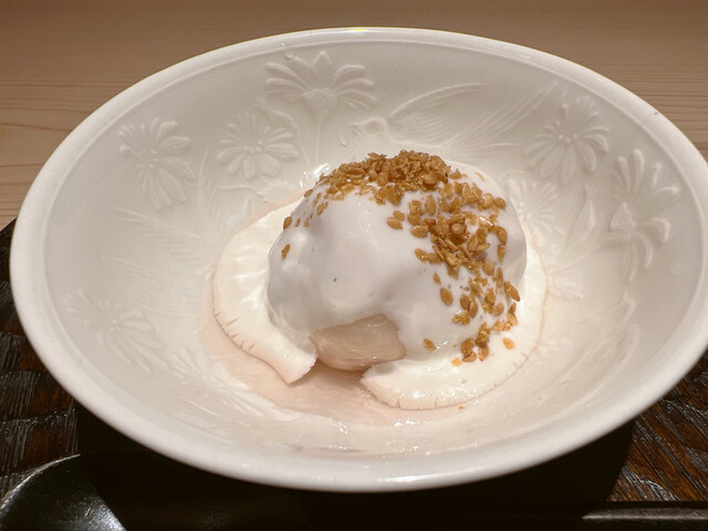 ⇒酒蒸しした無花果。胡麻を摺りおろして、ミルクを入れてとろみを付けて揚げて??(もうこの時点で食材や調理などは分かりません・・)
