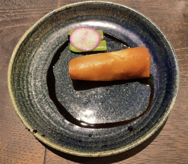 きゅうりの漬物、かぼちゃ餡の春巻きが乗っ