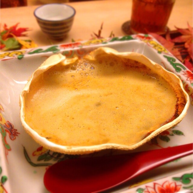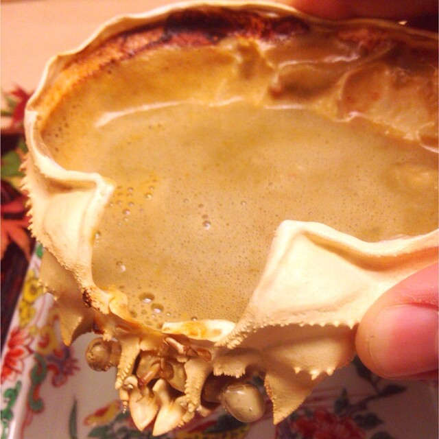 ・蟹甲羅味噌スープ・・・ウンマ〜〜♪(((o(*゚▽゚*)o)))初めて生の味噌を見た時はイソギンチャクか(・Д・)ノと突っ込んだのを思い出します。イソギンチャクが姿を変え濃厚な味噌と身のコラボに自然と笑顔が♡こちらはサラリーマン生活の2年3カ月のリハビリ治療になる癒しスープで、ほんまストレスの無い好きな仕事ができる喜びも噛み締めると自然に笑いが止まりまへ〜〜ん♪(*^^)o∀*∀o(^^*)♪
