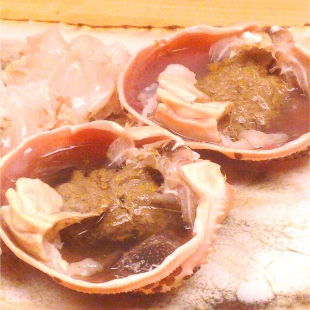 今思えば松葉蟹のタグ巡りで青タグ=津居山蟹、ピンクタグ=柴山蟹(最近のゴールド含む)、黄タグ=越前蟹、そして至高の緑タグ=間人蟹を制覇してきたけど、蟹に関してだけは採れたてを現代の名巧のいる旅館で最低一人一杯は食べ、浜値で買って足は花が咲くので生、他はそのまま丸茹でして食べたりしかした事がなかったのでテンション上がります♡