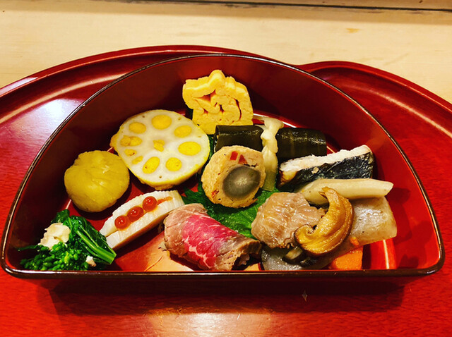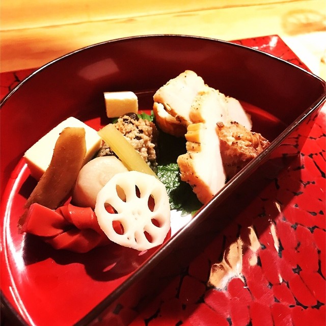 ☆祝膳(金柑、黒豆、数の子、ごまめ)・・・黒豆のコリッとした不思議な食感、数の子の上品な出汁感、ごまめは味が違うし笑!なんとカレー味です。ごまめを切り油で揚げてから味付けとの事で、カリッパリ食感の香ばしさはあります。