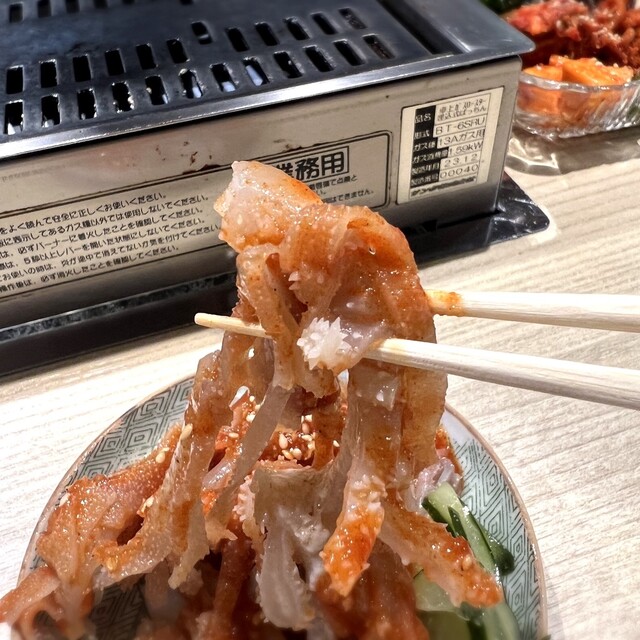 クニュプル食感でコチュジャンベースのピリ辛酢味噌ダレの甘辛さが白センマイと抜群の相性。添えてあるキュウリの食感とさっぱり感が絶妙な対比を生み出します。