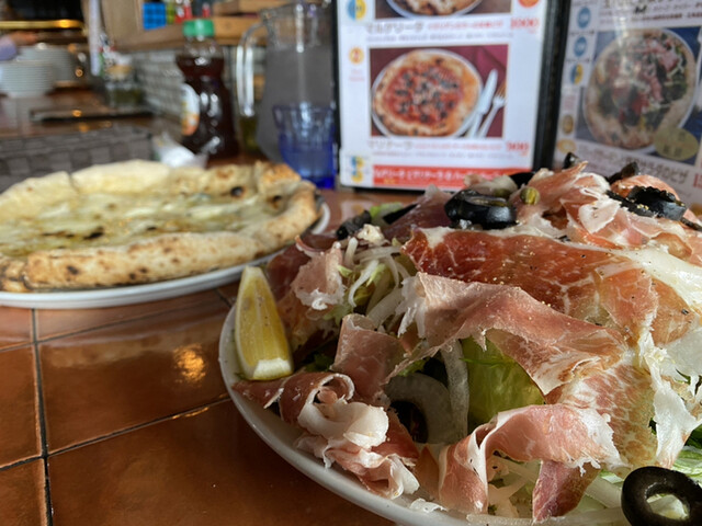 今日もオーダーは生ハム野菜サラダのピザだね。