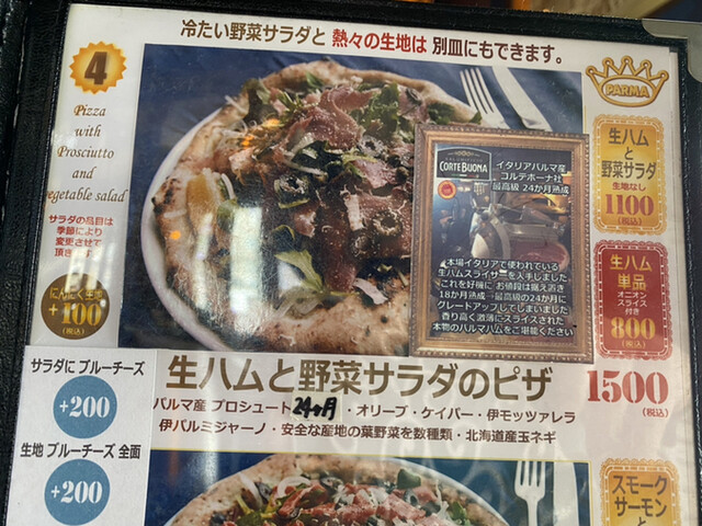 「生ハムと野菜サラダのピザ」を小さい子なら泣くかもしれん顔面をされているご店主さんにオーダーしますぞ。