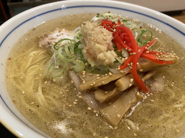 トンコツ+魚介の旭川ラーメンど真ん中の塩スープに、おろしたショウガと紅しょうが、さらに毎日お店で炒ってるゴマがベストマッチしてるべさ(^^)