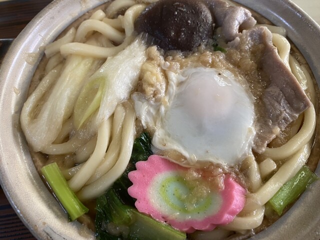 したら今日のとこは全メニュー制覇をいったん休ませてもらって「鍋焼きうどん(餅入り)」で身体をあっためるべさ。
