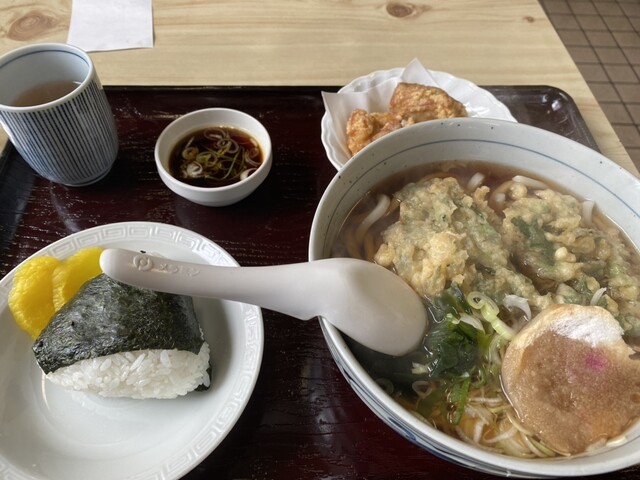 ちゅーことで「天ぷらうどん」をオーダーするべさ。あとは「ウメおにぎり」と「から揚げ」単品2個だべ。