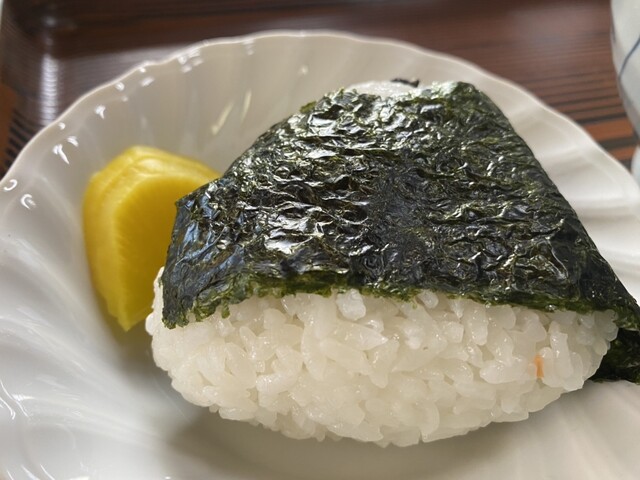 あと少しでうどんを食べ終わる!ってタイミングで「鮭おにぎり」にも手をつけますわ。