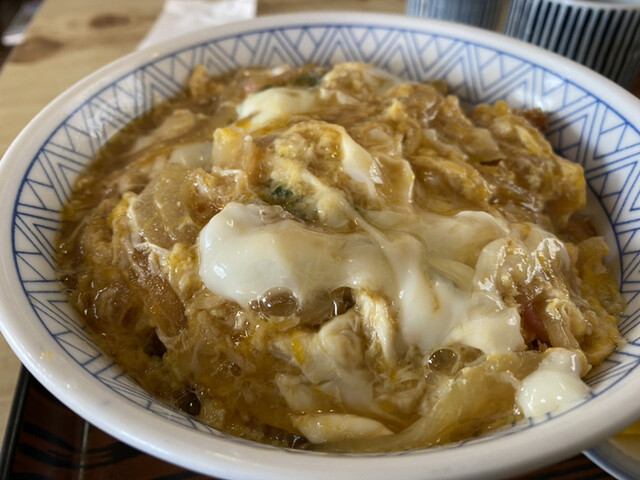 親子丼やカツ丼で馴染みのある甘いお出汁が汁だくなんだよ。玉子の他はタマネギと小さくて切られたかまぼこだな〜。