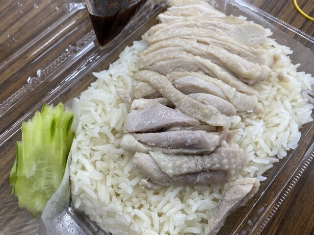 チキンのスープで炊いたタイ米(ジャスミンライス)に蒸されたチキンがのっからさってさ。エスニックなソースをかけて食うもんだべさ。