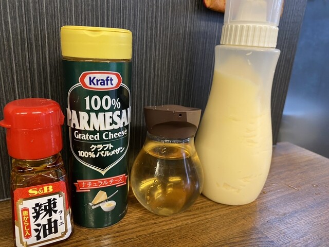 中太麺の小にしたんだわ。マヨネーズとか酢、粉チーズとかを適宜投入して味変をしてみたけど。うん、どれが正解なのかやっぱしわからんかった(^^)