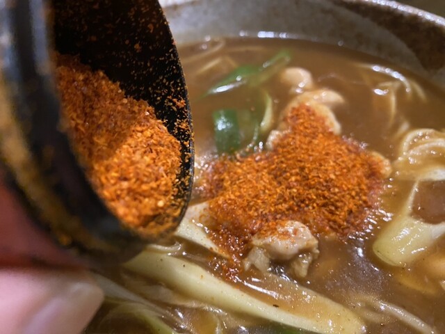 いつもなら、敬愛するマイレビュアーさんのこよなく…さんの指示に従って、一味は少量にしてるんだけど。申し訳ないね、あまりにも暑いんで、大量に一味をぶっ込んでしまったわ。