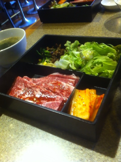 肉以外には、ライス、スープ、キムチ、サラダが付いています。