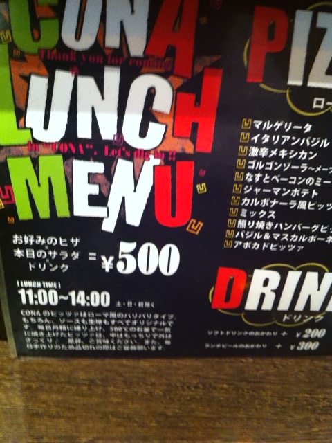 ランチのメニューはピザが20種類ぐらいから選べ、サラダと飲み物がついて500円です。