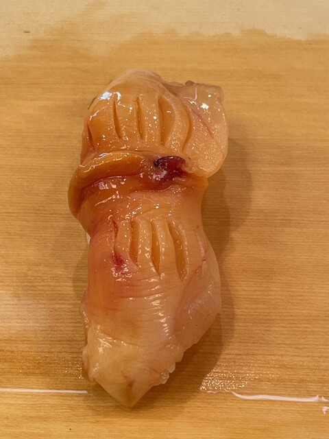 鮨ネタでもっとも手間のかかかる逸品は「煮はま」です。このネタのない店は江戸鮨とは言えません。この店の煮はまぐりは、ハマグリが固くならず、ミディアムレアの感じで仕上がっている絶品です。