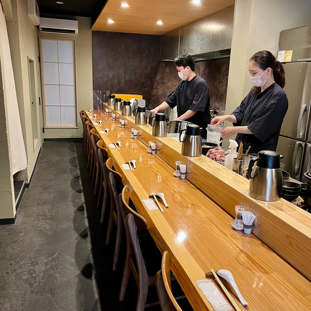 カウンターに座り袖岡さんと山本君の所作を眺めながら着丼を待ちます