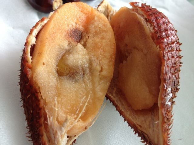サラックはヤシ科の果物だそうで、殻はトゲトゲして痛いです。 中身は薄いオレンジで、ほのかな甘さと酸味があります。 個体によって味にばらつきが