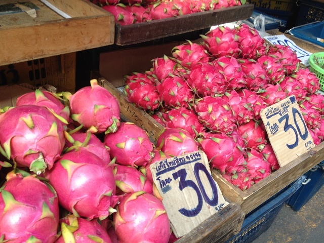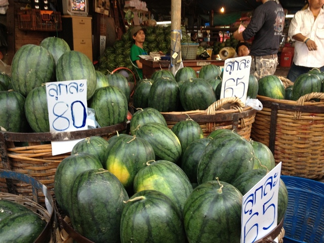クーロントーイという市場がありますが、こちらでは、スイカは一つ50バーツくらいからあります。 しかも、中身は鮮やかな赤で、味も濃いです。