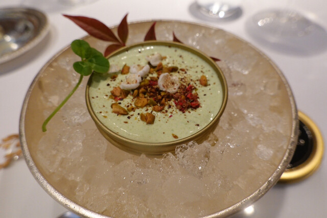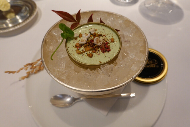 冷たいものはカルパッチョ。そして、温かいお皿は、クレソンのスープに真鯛のすり身を浮かせたもの。