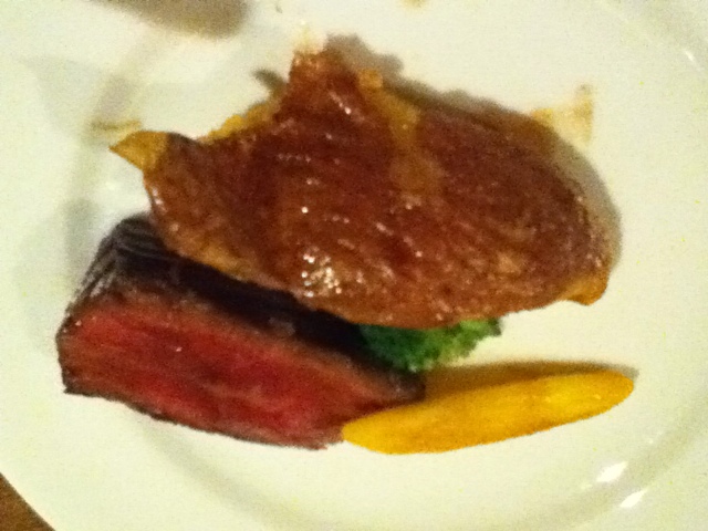 山口県萩から届いたカワハギのポワレ、滋賀県産近江牛のイチボステーキ マデラソース、フランス産鴨胸肉のロースト 白レバー風味 ポルトソース