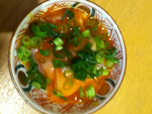 さらに北海道産オーロラサーモンの小鉢をサービスしてくれました。ご飯とお味噌汁をお代わりして、柳川鍋をご飯にのせて食べました。はっきり言ってうまいです。