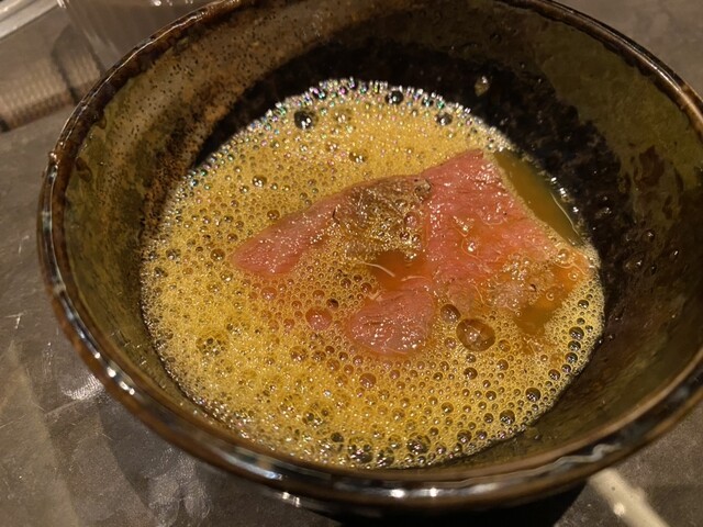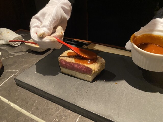 素晴らしい素材の赤身肉を、生肉からスタート。肉の刺身、ユッケ(バケットと共に)と来て、タン2種の焼きへ。2種類目のタンは塩昆布との相性が抜群でした。サラダを挟んで、そこからはタレ焼きへ。場面転換の演出が素晴らしい。レア部位が次々と供されました。なかでも、すき焼きに使う卵にトリュフがたっぷり入っていて、それをご飯に加えた『トリュフ卵かけご飯』が最高でした。最後は手延べそうめんと、かき氷二種。感動しました。料理はすべて、個室でご担当者が専任で提供してくださいます。ご馳走様でした