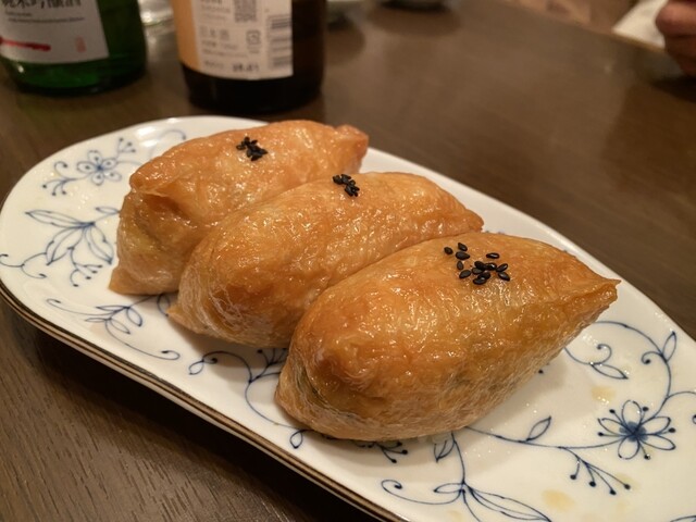 『お刺身』『貝』『煮魚』はじめ、『アスパラ』、さらには揚げ物『クリームコロッケ』も抜群。『クリームチーズ』には葉唐辛子が練りこんでありました。女将さんが仕入れた魅力的な日本酒が『梅水晶』で進みます。最後は『いなり寿司』でとても満足させていただきました。有難うございました。