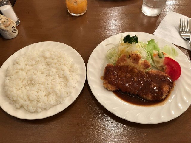 オーダーはカツで。ハンバーグもでっかくってパンチがあって好みなので、相当悩みましたが、ちょっと上品なポークカツレツ。