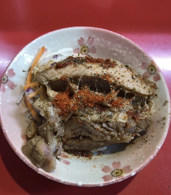 ラーメン 麺140g ヤサイ少な目・ショウガ・アブラちょっとのカラアゲ別皿で 750円に卓上調味料でカスタマイズ