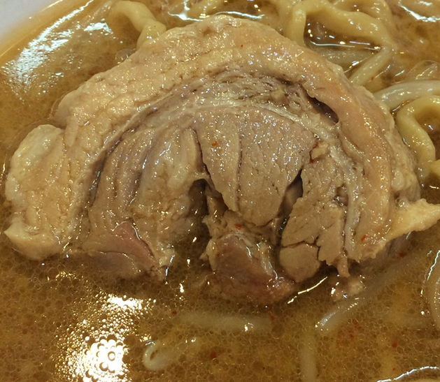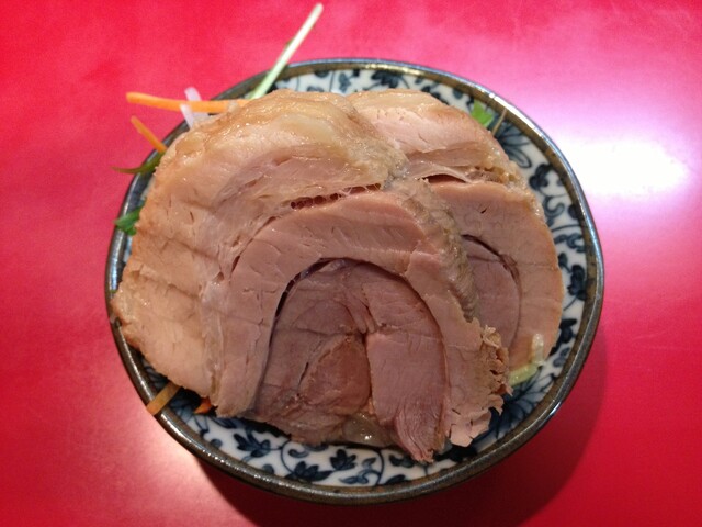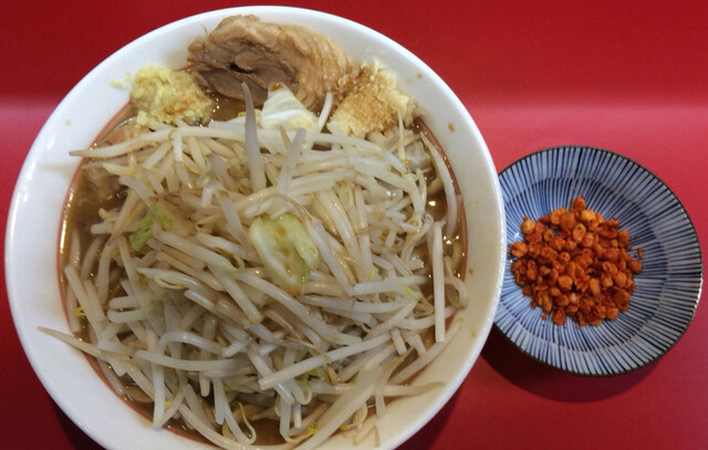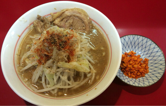 3ヶ月ぶりの訪問。3周年の限定メニューはハードルが高く、訪問したいしたいしたいと思いつつ、限定終わった数日後に訪問。前回コメントしましたが、ここは二郎インスパイア完成系というより、もはや千里眼として美味しいな。店内6人待ちくらいでそれほど待たず、いただけました。スープのパンチ(麺130グラムで野菜デフォでカラメアブラだとガツン力増します)はいつもながら唸る旨さ。レッドホット千里ペッパーの名残か、噂のデスソースは卓上にあったので、ヤサイに2滴垂らし、恐る恐る体験。2滴でも辛味の旨味が刺激します。また今回は歴代一番旨いブタにヒット。千里眼では巻きブタ半分とかけらがいつもらーめんでは供されると思いますが、かけらのホロホロとろけ感が半端なく美味しかったです。いつ来ても満足。