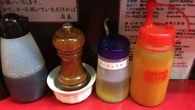 スープのパンチを味わいながら、ほぼ空のデスソースをヤサイにどばっと垂らし、ヤサイとスープと麺を絡めて食べ進めます。ホロホロブタを食べながら、黒胡椒や一味をちょいちょい利用し、最高に旨い1杯となりました。いつ来ても満足。