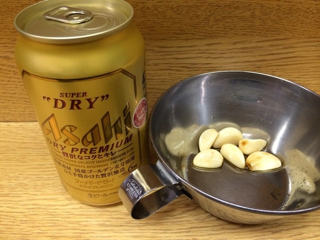 醤油漬けにんにくとASAHIプレミアムドライ 350円